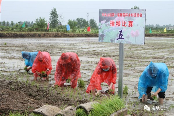 牛头山古称舞鸾乡,万子村曾名三万圩,在当天的活动现场,还举行了牛头山镇第一届舞鸾乡杯乡村运动会,在一旁的插秧体验区,一个个插秧高手早已蓄势待发。比赛正式开始后,大家纷纷拿着绿油油的秧苗,撸起袖子就下了田,一株株秧苗在高手们的操作下迅速立在了田里,凭借着老到的手法,插秧进度快速拉满,现场你争我赶,好不热闹。而在另一处的体验区,抓鱼、套大鹅、钓龙虾等趣味活动同样也精彩纷呈,活动勾起了不少游客的童年记忆,买票进场后,收获的“战利品”均可以自己带回家,带着满满的收获,不少游客尽兴而归。