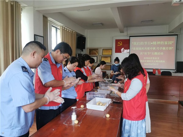2023年传统的中秋节和国庆节恰逢相邻,为弘扬中华民族优秀传统文化,丰富辖区居民的精神生活,9月27日,在双节来临之际,杏花村街道杜坞社区联合共建单位开展“我们的节日·精神的家园—喜迎国庆共度中秋 巧手做月饼”的庆双节主题活动。