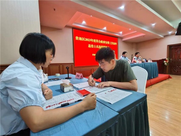 9月27日上午,贵池区组织召开2023年度符合政府安排工作条件退役士兵选岗现场会,根据《退役军人保障法》有关规定,该区41名退役士兵对照兵役档案量化评分结果从高到低依序完成选岗。