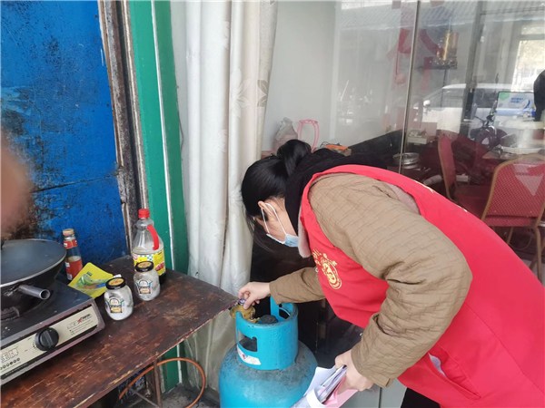 同时社区工作人员深入到辖区商铺,对商户使用的液化气瓶的管件、阀门、胶管、是否安装燃气报警进行了仔细检查,对存在的问题一一告知,并限时整改。检查现场还向商户发放了燃气安全宣传单,引导他们正确用气、规范用气、安全用气,加强日常自查自改,及时消除安全隐患。