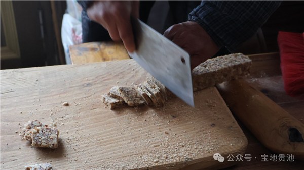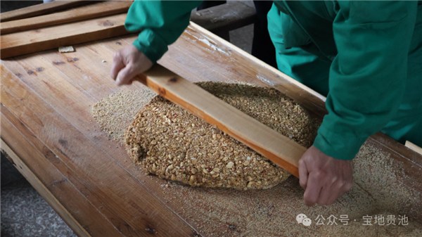 待糖些微冷却,章师傅便麻利的加入炒熟的芝麻及花生搅拌均匀,团成块状,一旁的帮手迅速将糖块移至切糖间,两块木板一夹,不停用制糖工具压实拍打,趁着米糖尚未凉透进行人工切条改刀,一片片香脆甜美的元四芝麻花生糖就做好了。