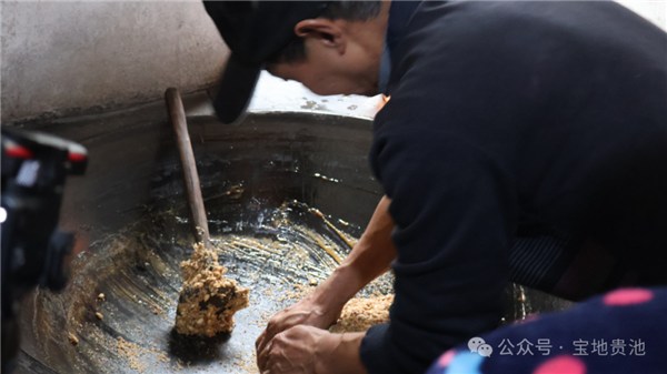 大约至上午十点多,经过4—5个小时的熬制,锅里的糖浆逐渐熬成了糊状,这时章师傅就要用木镐在锅里不停地搅拌,不时用木镐将糖稀挑起,吹气加速冷却,根据糖稀挂淋情况,判断是否成功及优劣。如果成功了,就要马上起锅。