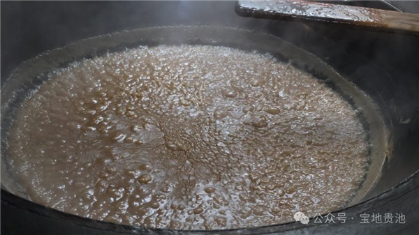 早上六点左右章师傅就要开始熬糖了,将糖汁放在大锅里,用柴火慢慢煮熬,此时要做到灶台边不离人,添柴减柴把握好全程火候。