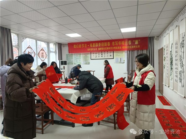 2月4日,池阳街道烟柳园社区邀请了三位书法老师,活动现场红纸翻飞、墨韵飘香。书法老师们挥毫泼墨书写喜庆吉祥“红红火火”的新年愿景,大家喜笑颜开地挑选对联、压纸、晾纸,好不热闹。