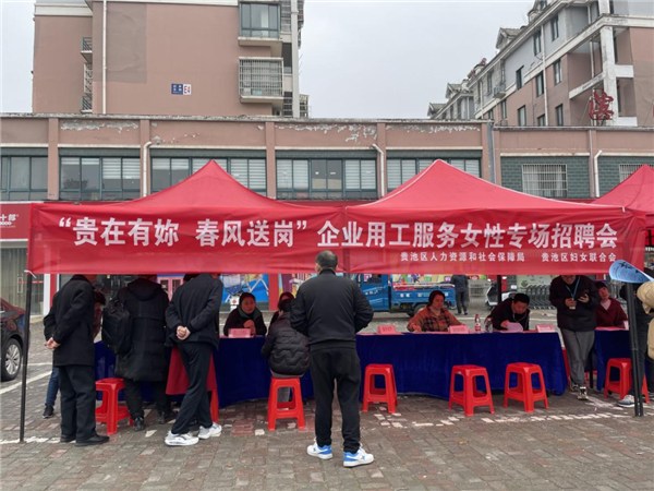 为扎实推进“人才贵池行”工作,2月19日(正月初十)上午,区妇联、区人社局在政务新区银海花园小区(幸福广场)对面举办了 2024 年首场“贵在有妳 春风送岗”女性专场人才招聘活动,受到求职者的热烈欢迎。