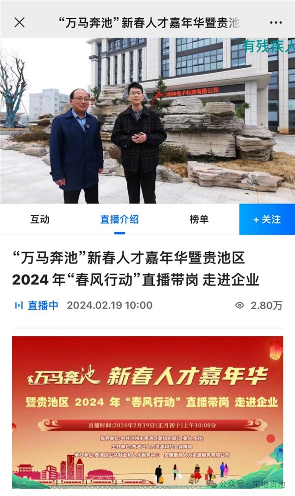 “今天,我带大家现场感受一下池州九华明坤电子科技有限公司的办公环境和企业文化,看下他们还有哪些岗位空缺......”2月19日,区人社局党组书记、局长丁勇不仅化身成为“主播”,还打破了传统“直播带岗”的陈述模式,将直播间“搬到”了企业车间,带领着求职者们“云端”探企,同步推介需求岗位的招聘信息。