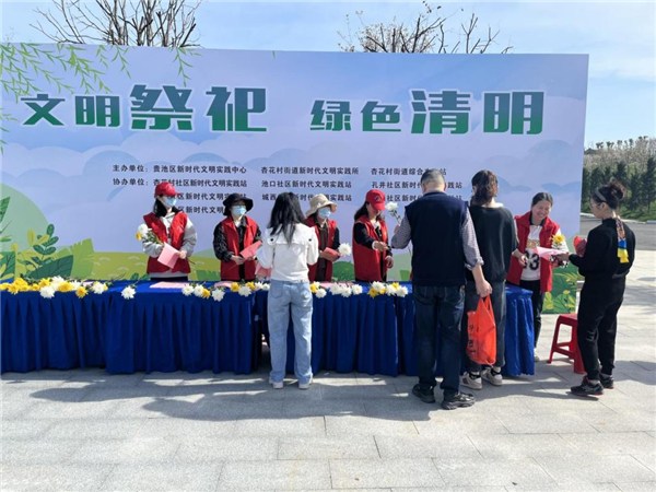 趁着春光明媚,志愿者一边向来往祭扫的群众介绍清明节的起源和风俗习惯,一边向群众发放“文明祭祀、绿色清明”倡议书,在宣传文明祭祀的重要性的同时,建议群众以鲜花的方式表达心中的思念。清明祭祀,是中华民族的传统风俗习惯,古人称这个时节“万物生长,此时,皆清洁而明净,故谓之清明”。一方面倡导大家树立环保意识,文明低碳祭扫,自觉遵守祭扫活动相关规定,不在道路两侧和楼道等地焚烧冥纸,不在山林、草场、墓地等烧纸焚香,防止因燃放鞭炮、焚香烧纸引发的火灾隐患;另一方面提倡绿色低碳出行,爱护自然环境,让传统节日回归清净与文明,让清明节重现“清明而洁净”。以敬献鲜花的方式祭拜,更能表达哀思和敬意,于逝者也是最好的纪念和安慰,值得推广和提倡。