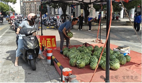 据区城市管理局相关负责人介绍,每个西瓜临时销售点都有统一标识,并对这些临时销售点实行建档管理,一处一档,要求各销售点瓜农保证秩序和环境卫生,不能乱扔垃圾、不能影响交通。同时积极引导瓜农改变传统售卖理念和方式,鼓励他们进入小区、农贸市场、超市等地销售。