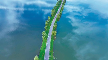 直到2022年夏季的一个午后,阳光、云朵、湖面与那条蜿蜒的水中小道奇妙地融合,形成了一幅令人震撼的画面——“天路”。饶颐用无人机镜头将这份“惊艳”摄录下来,并发布在个人社交媒体账号上,迅速火爆全网。在这之后,拍摄“天路”几乎成了饶颐每隔几天就要进行的必选动作。