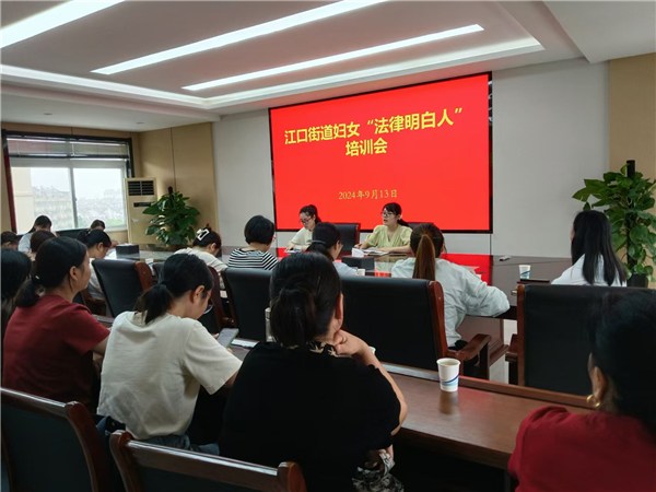 为进一步推进江口街道妇女“法律明白人”培养提质增效,提高妇女群众的法治素养,切实维护妇女的合法权益,9月13日,江口街道在五楼会议室召开“法律明白人”培训会,会议由街道司法所所长江竞帆主持,街道及社区妇联主席、妇联执委、巾帼“法律明白人”等30余人参加培训。