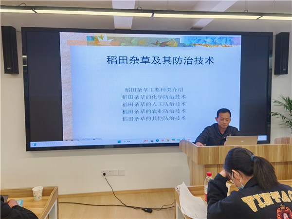 培训现场,科技特派员鲍站长在讲台上,身后的大屏幕上清晰地展示着“稻田杂草及其防治技术”的相关内容,涵盖稻田杂草主要种类介绍、化学防治技术、人工防治技术、农业防治技术以及其他防治技术等多个方面。