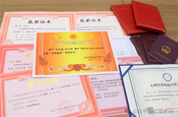 这份对幼教事业的热忱与专注,让她的课堂教学日渐成熟,也喜获硕果。一张张荣誉奖状既是对她工作的认可,更是她深耕幼教领域的生动见证,持续激励她不断前行。