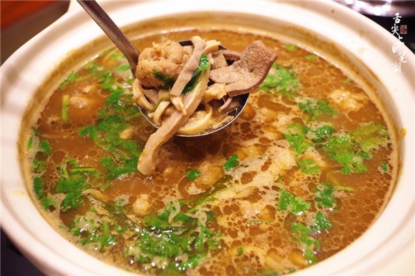 在贵池人的记忆里,“杀猪汤”是一种特别的存在,它不属于任何一个节日,却有着与节日等同的庄重感。过去农村生活条件差,几乎家家户户都养猪,临过年时,就请杀猪师傅把猪杀了,能卖的全都卖了换钱,只剩下猪头、猪肝、猪血、猪肾不怎么有人要,主人家便把它们切成薄片,带芡粉氽成一锅汤,用来招待杀猪师傅和前来帮忙的亲友邻居,这道菜就叫杀猪汤。