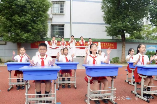 当天上午9时,示范性入队仪式正式开始。旗手与护旗手迈着铿锵有力的步伐护送少先队队旗入场,全体队员肃立立正、庄严敬礼,目光紧紧追随着鲜红的队旗。嘹亮的队歌声中,新队员们整齐列队,在老队员的见证下迎来庄严而热烈的入队时刻。老少先队员们有序走到380余名二年级新入队少先队员面前,小心翼翼地为他们佩戴上鲜艳的红领巾。鲜红的领巾在胸前飘扬,既是一份荣誉的象征,更是红色基因代代相传的生动见证。“准备着:为共产主义事业而奋斗!”面对庄严的队旗,大家高举右拳,以洪亮的声音庄严宣誓,铿锵有力的誓言响彻现场,回荡在校园上空,满含少年们的朝气与信念。仪式结束后,队员们进行了“课间乐乐乐”的风采展示,整齐划一的动作,热情灿烂的笑容展现了大家昂扬向上、奋勇向前的精神风貌。