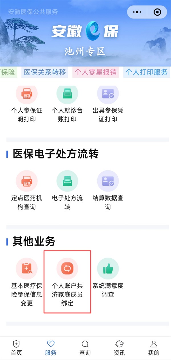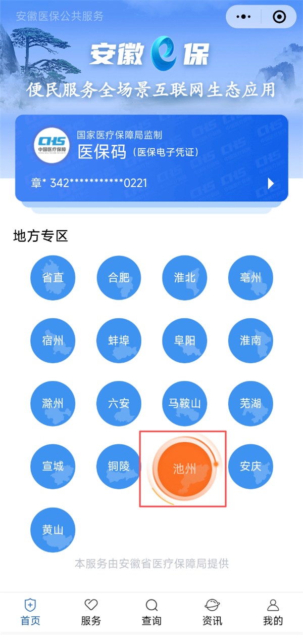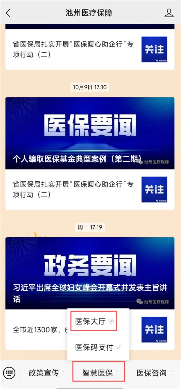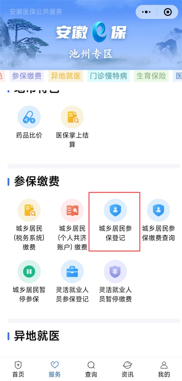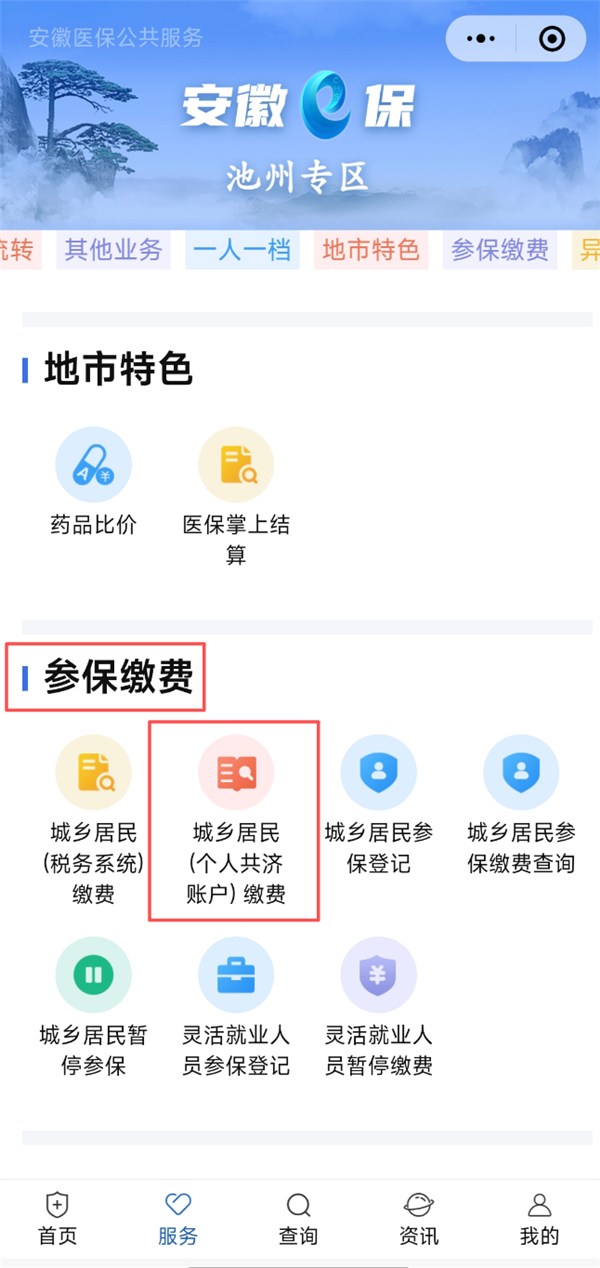 (二)线上办理:关注并打开【池州医疗保障】微信公众号,选择【智慧医保】—【医保大厅】,地方专区选择【池州】,菜单栏点击【参保缴费】模块的【城乡居民参保登记】。