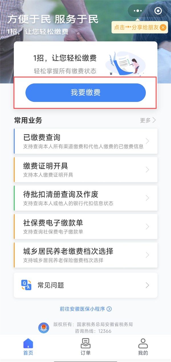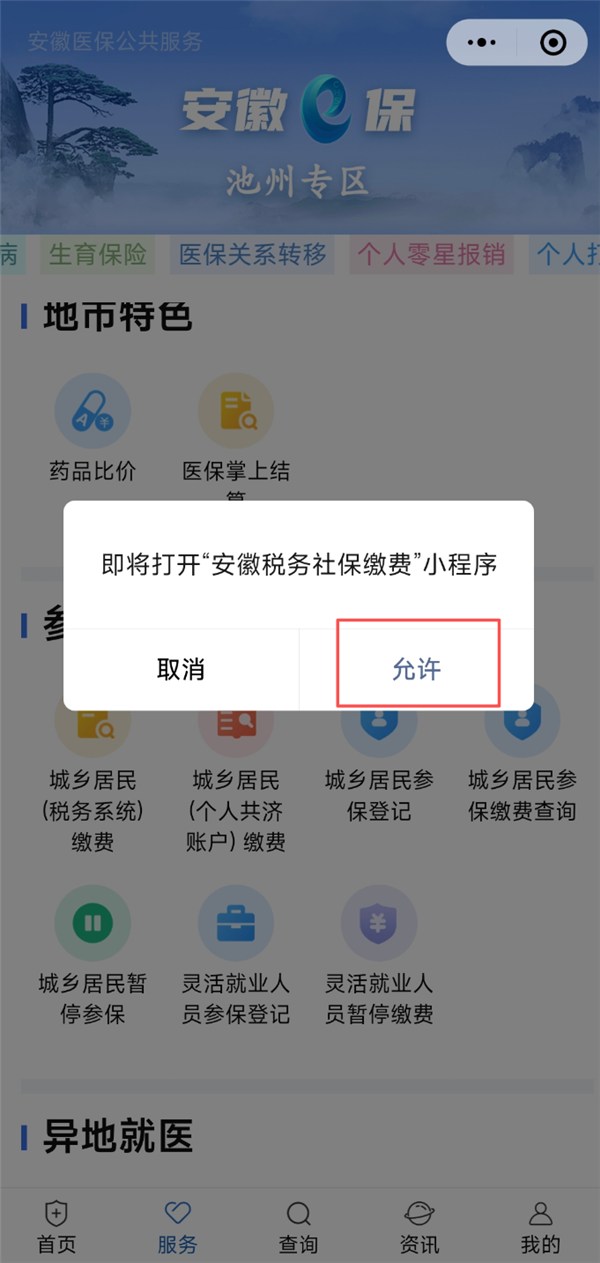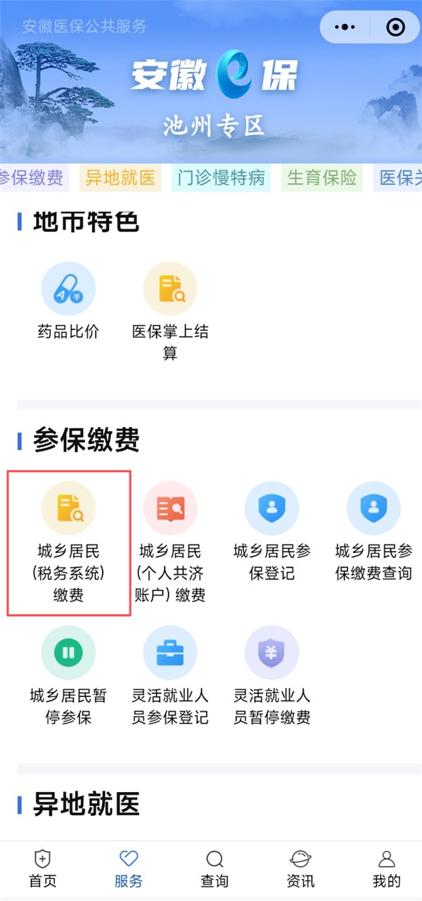 (一)微信缴费流程:关注并打开【池州医疗保障】微信公众号,选择【智慧医保】—【医保大厅】,地方专区选择【池州】,在【参保缴费】模块选择【城乡居民(税务系统)缴费】,弹窗选择【允许】进入【安徽税务社保缴费】小程序;也可以直接在微信首页搜索【安徽税务社保缴费】小程序。