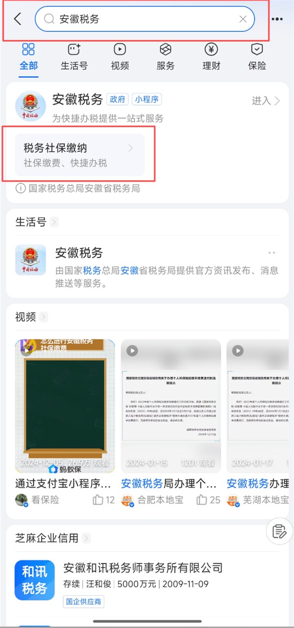(二)支付宝缴费流程:支付宝APP搜索【安徽税务】小程序,选择【税务社保缴纳】。进入个人社保办费平台页面,点击【社保缴费办理】,缴费办理对象选择本人或他人,进行缴费。