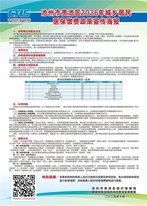 据介绍,2026年城乡居民医保个人缴费标准为每人每年400元,政府补助标准提高30元到每人每年不低于700元。集中征缴期为2025年10月20日至12月31日。目前,线上线下缴费渠道已全面开通。线上可通过“池州医疗保障”微信公众号、安徽医保公共服务平台、皖事通APP、“安徽税务社保缴费”微信小程序、支付宝等平台“掌上办”;线下保留村(居)委会集中代收等传统渠道,方便老年人等群体就近办理。广大城乡居民可向当地医保经办机构、村(居)委会咨询,或登录官方线上平台查询办理。区医保局负责人提醒全区参保对象,请及时完成参保缴费,确保2026年度医保待遇正常享受。
