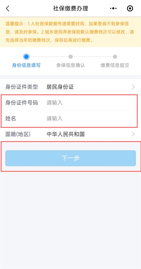 点击【我要缴费】,输入参保人信息,点击【下一步】,完成缴费。
