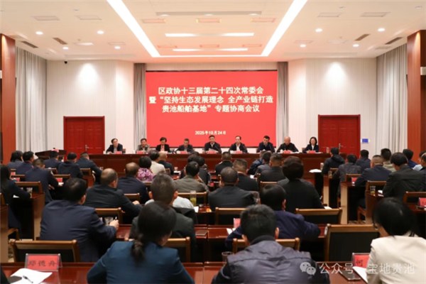 10月24日,区政协十三届第二十四次常委会暨“坚持生态发展理念 全产业链打造贵池船舶基地”专题协商会议召开。区委书记何刚、区政协主席鲍胜利出席会议并讲话。