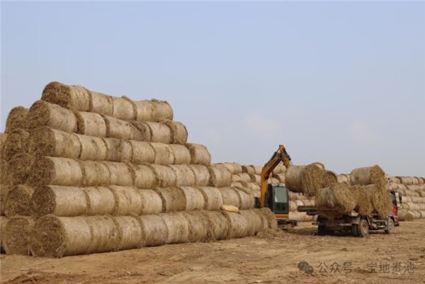 离田后的秸秆,踏上了“变废为宝”的旅程。不远处,众丰公司今年在秋江街道新建的秸秆综合利用饲料工厂内,工人们正熟练地将收来的秸秆“喂”入生产设备,坚硬的秸秆经过加工,瞬间变得柔软细碎,随后被迅速打捆、包膜。这些包裹严实的草捆经过发酵,将变身成为牛羊禽类喜爱的“营养罐头”。