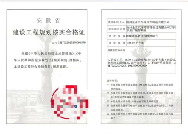 池州金亚汽车零部件制造有限公司万向节生产销售项目建设工程规划核实合格证公示