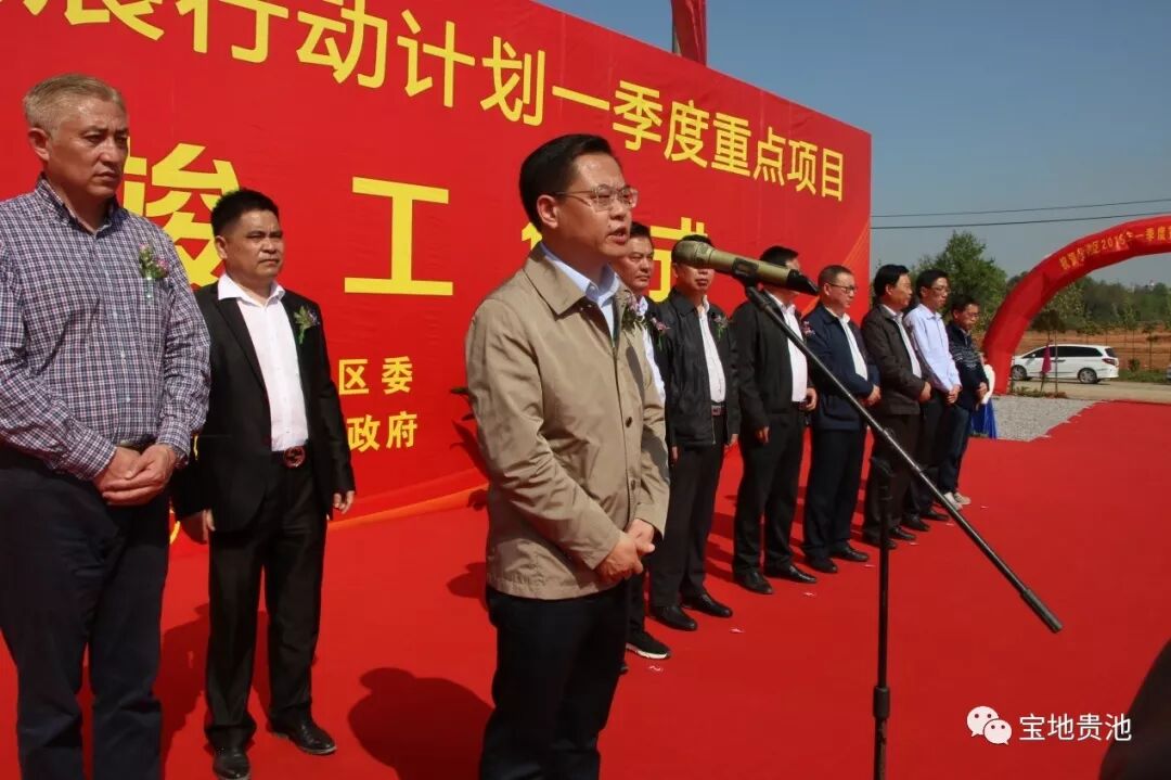 4月8日上午,全区一季度12个重点项目在池州高新区前江园区举行集中开工仪式。仪式现场,多辆挖掘机、工程车紧密布列在会场两旁,“热烈祝贺全区一季度重点项目集中开工仪式成功举行”条幅格外醒目。