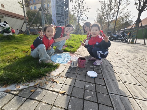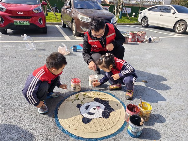 活动现场,在老师的专业指导和协助下,六名小志愿者化身“社区美容师”,手持画笔,满怀热情地投入到创作中。他们神情专注,先用粉笔勾勒轮廓,再用颜料仔细填充。原本冰冷、单调的井盖和排水盖板,在他们的巧手下渐渐“活”了起来——有捧着竹子憨态可掬的大熊猫,有仿佛正从工地驶来的小卡车,还有向孩子们打开知识大门的书本……一个个生动活泼、色彩明快的图案跃然“盖”上,引得路过的居民纷纷驻足欣赏,有的还打卡拍照。