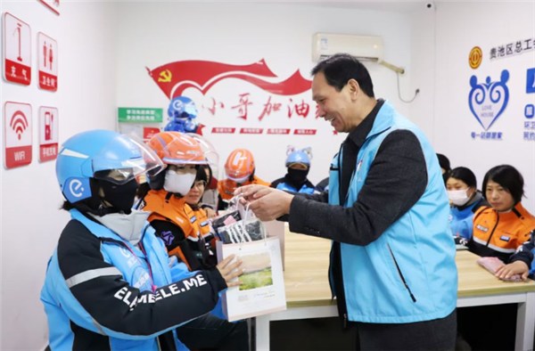 在安徽省池州市贵池区饿了么运营中心工会驿站,环卫工人王国辉推门而入,弯腰接满一杯热水,赶忙坐下来长舒一口气。“天气越来越冷,有这么个地方能随时喝上一口热水暖和暖和,挺好的。”