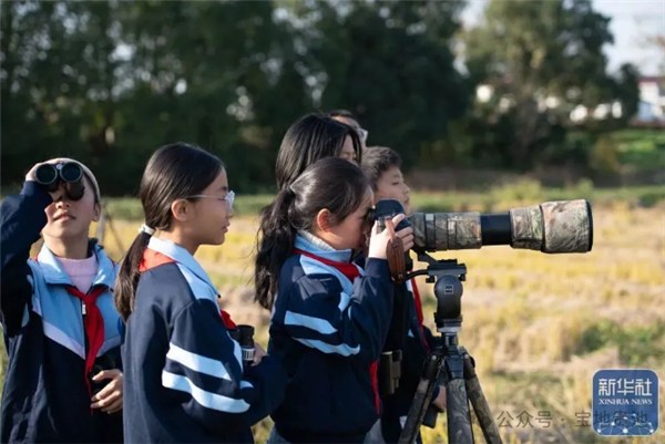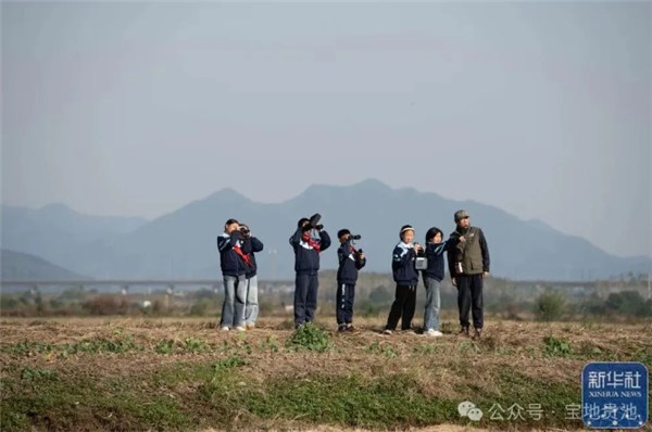 11月18日,在位于安徽省池州市的十八索省级自然保护区,茅坦小学的学生在野生鸟类保护志愿者的带领下观察鸟类。