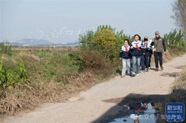 11月18日,在位于安徽省池州市的十八索省级自然保护区,茅坦小学的学生在野生鸟类保护志愿者的带领下观察鸟类时,他们身后出现了一群白鹭。