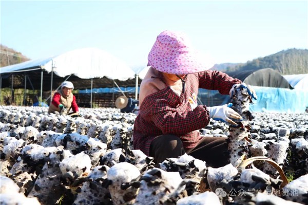 初冬时节,棠溪镇曹村村生态食用菌种植基地一派热闹景象,一排排菌棒整齐划一地立在田间,上面长满了肥厚黝黑的“小耳朵”,村民们正手法娴熟地采摘、搬运、晾晒,脸上洋溢着丰收的笑容。