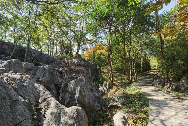 初冬之际登临齐山,呼吸一下远离城市的纯洁空气。此时的齐山,色彩斑斓,沿着石阶蜿蜒而上,摩崖石刻如时光书页般点缀其间——最引人注目的当属包拯题写的“齐山”二字,笔力遒劲,其沉稳刚健的字体恰似包公本人的京剧脸谱形象:大眼长须,端正凛然,无声诉说着刚正不阿的千古风骨。