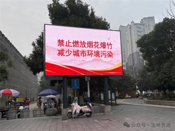 该街道坚持宣传先行,织密线上线下宣传网络,充分利用横幅、电子显示屏、广播喇叭、居民微信群等宣传载体开展常态化宣传,累计悬挂横幅95条、启用电子显示屏宣传点位13处、播放广播喇叭94处,在77个小区张贴禁燃禁放《通告》,通过169个居民微信群及时推送政策要求与倡议,做到宣传全覆盖。该街道环保站统一印制10000份烟花爆竹禁燃禁放一封信,组织工作人员逐户开展“敲门行动”,面对面讲解禁放范围、时段与违规后果,阐述燃放烟花爆竹的安全隐患与环境危害,及时解答居民疑问。