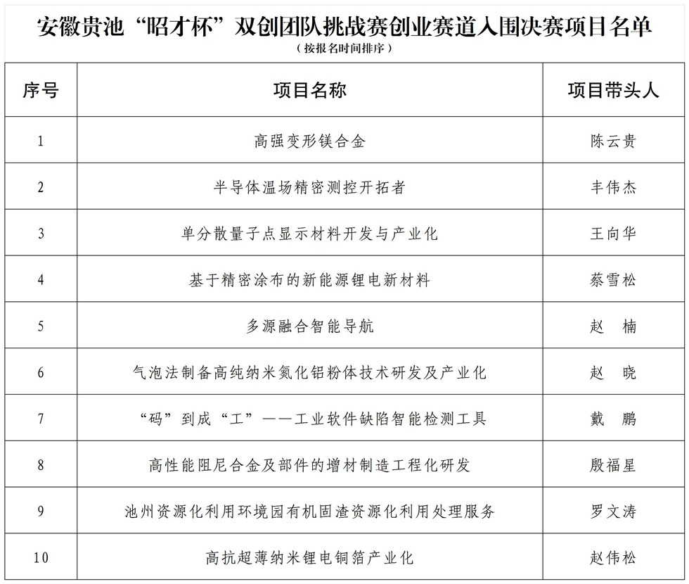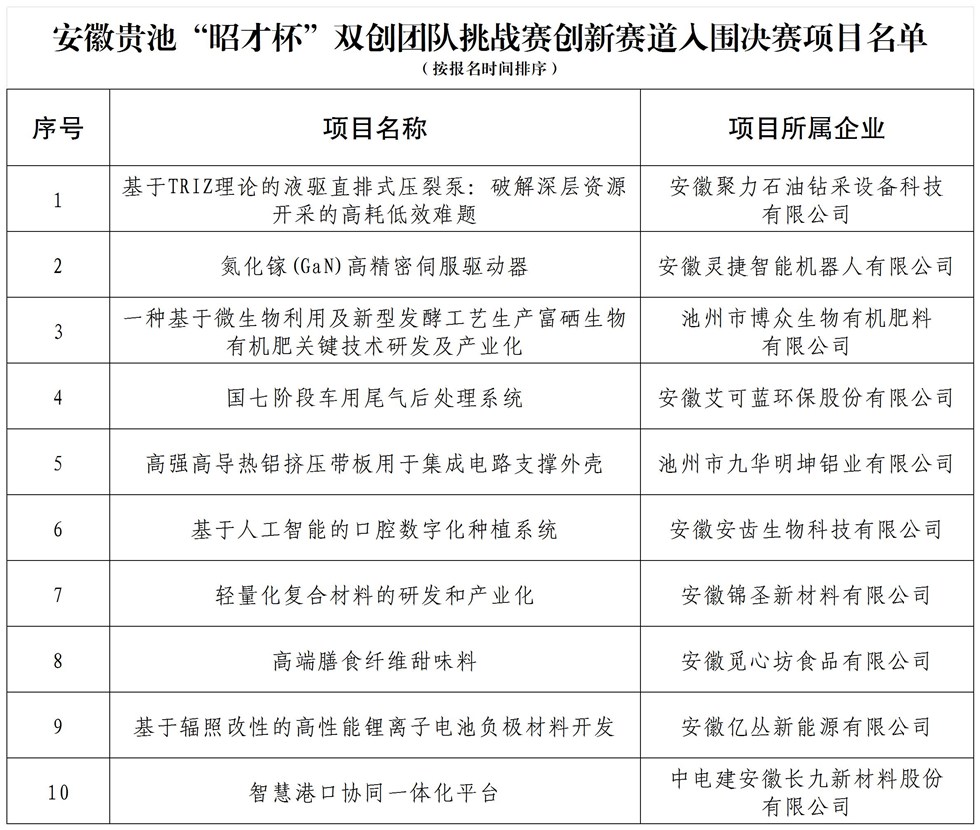 经项目初核、尽调并报大赛组委会研究,现公布安徽贵池“昭才杯”双创团队挑战赛入围决赛项目名单。项目入围决赛后如未参加路演,视为放弃参赛资格,且名单不再递补。
