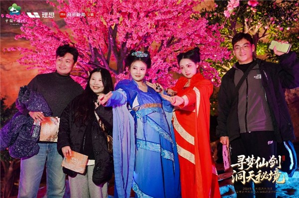 活动中,大王洞景区紧扣《仙剑》IP,将天然地质奇观与经典影视元素深度融合,专业Coser化身李逍遥、唐雪见等角色与游客互动,任务卡集章、御剑教学、角色巡游等环节趣味十足,AI拍照机更让游客秒变“仙侠主角”。