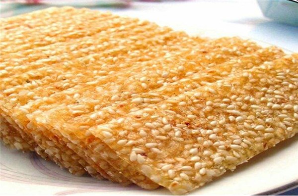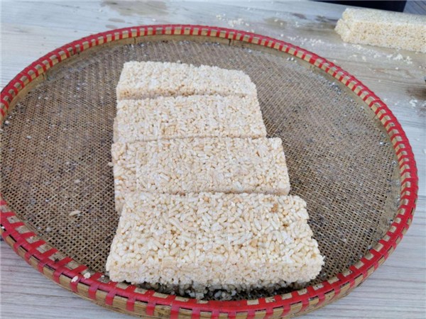 乌沙交切又称浇切、焦切,是乌沙镇的民间传统糕点。其主要以芝麻仁、麻油、麦芽糖、饴糖等为原料,具有“香、甜、薄、脆”的特点。“交(浇)”是指把糖液浇在炒熟的芝麻仁上,边浇边拌,然后用木滚筒碾压成薄片状,“切”是指将大块的半成品切成小块的长方形。“交(浇)切”经过芝麻炒香、熬糖、拌料、压片、切片等工序制成,是一种又浇又切、先浇后切而做成的糖片。