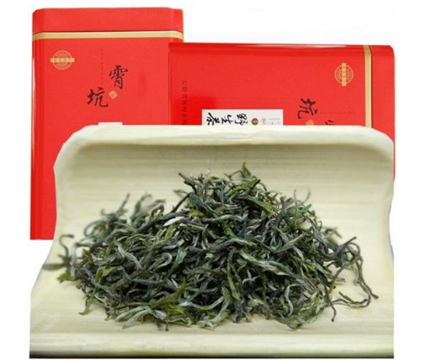 霄坑绿茶是中国地理标志产品,产于平均海拔700米的高山之上。这里优质大叶马兰枝茶树的鲜叶生长期长,出茶较晚,氨基酸、茶氨酸及水溶性成分含量高,鲜叶经过“摊青一杀青一揉捻一干燥”等制作工艺,其外形紧结壮实,色泽翠绿油润,冲泡香郁芬芳、回味甘甜,汤色清澈绿亮,叶底嫩绿完整。