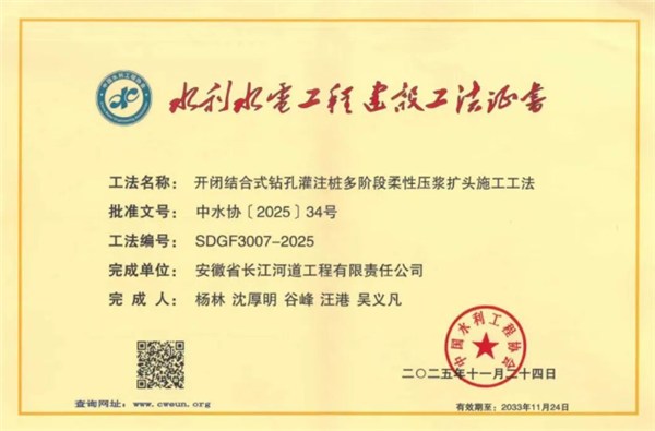近日,池州市贵池区建国排涝站拆除重建工程建设管理处组织施工单位安徽省长江河道工程有限责任公司申报的“开闭合式钻孔灌注桩多阶段柔性压浆扩头施工工法”,经中国水利工程协会严格评审,成功获评优秀工法并颁发认证证书。这一殊荣不仅标志着该施工技术获得水利行业权威认可,更彰显了建国站拆除重建工程在技术创新与质量管控方面的突出成就。