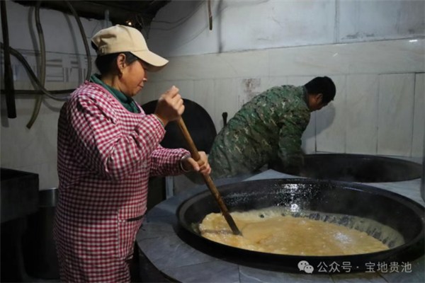 “一天下来就做一锅,50斤的糯米能熬出近35斤的糖。”钱立胜感慨道,小时候每逢年关,家家户户都会开始熬糖,如今村里还坚持做糖的只剩下两户。做糖的手艺薪火相传,对他来说早已不只是谋生的手段,更承载了记忆里的独特年味。当一年的收成被熬煮成一锅甜蜜,这份香甜远不止于满足口腹之欲,还承载着代代相传的祝福和期盼。