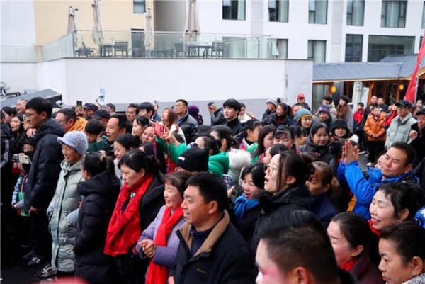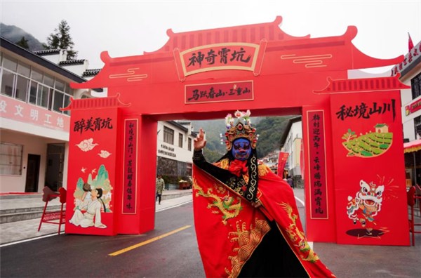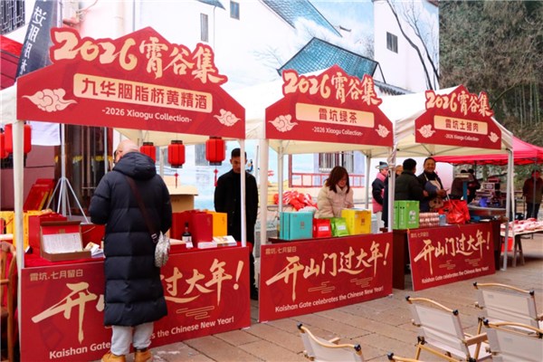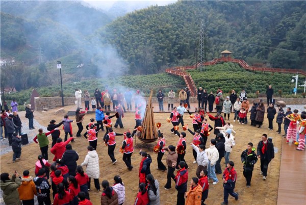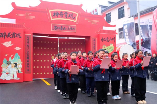“刚好孩子放假,我们计划着一路游玩回去过年,在这里感受的原生态风情既有烟火气,又贴近自然,简直太值了!”来自浙江宁波的游客周健直言。当天一大早,他便带着孩子走进热闹的年味市集,走过摆放着霄坑绿茶、古法麦芽糖等充满乡土气息的市集,领取了寓意吉祥的手写春联,亲手体验石磨豆腐,周健感受到了别样的年俗氛围。“开——山——门!”鼓点起,童声诵,随着一声高昂嘹亮的号子声响起,红色大门缓缓打开,在蓝、红舞狮的带领下,许多和周健一样的游客逐步深入“秘境”。为革命烈士献花,百年茶王树下的醒春礼,绿茶博物馆内的燃薪礼,游客在巡游中亲身感受着村民们对自然馈赠的感恩和对新一年风调雨顺的美好祈愿。