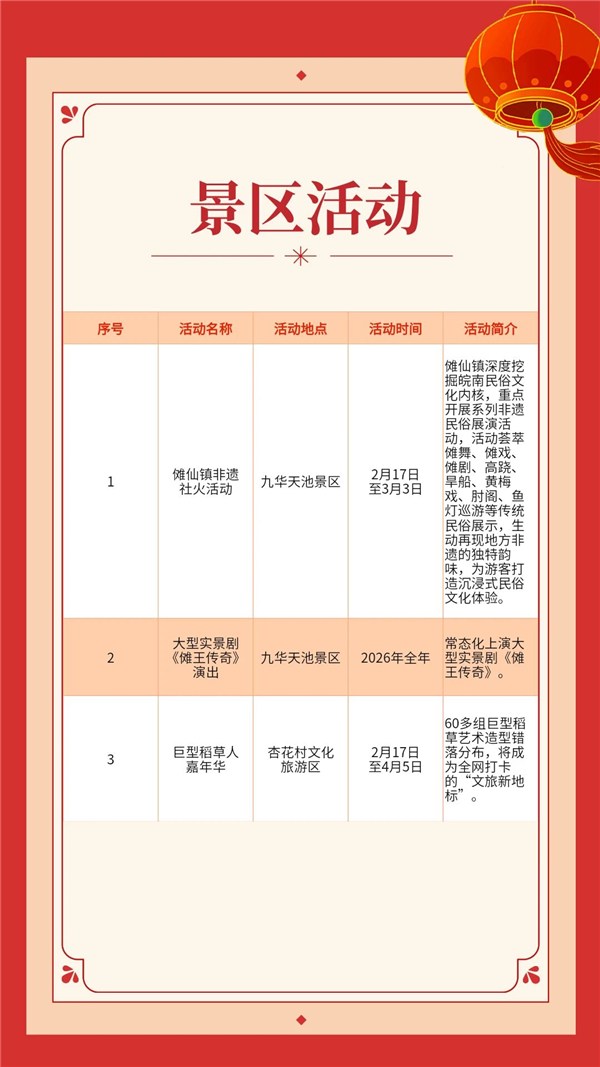 2026,在贵池,过个“不一样”的马年!如果还在寻找记忆里的热闹年味,那么,请来贵池。从初一至元宵,超多好戏轮番上演!看一场穿越千年的神秘傩戏,逛一场人声鼎沸的年味大集,在新春游园会里邂逅满满惊喜……我们备好了所有的热闹与温情,只为承包你一整个春节的欢笑与期待贵池新年企划,就等你来签收。