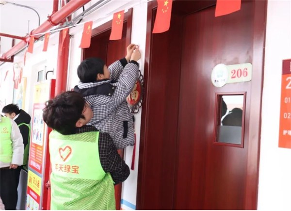 随后,孩子们分组行动起来,亲手为老人们的房间添上年味。贴窗花、挂福字,个子矮小的孩子够不着窗框,大学生志愿者便笑着将他们稳稳抱起。“左边高一点,再高一点!”在五年级女孩小慧(化名)的“指挥”下,志愿者殷明昊配合着调整位置,一副精美的窗花很快便端端正正地贴在了窗户中央。不一会儿,走廊里、房间内,处处跃动着喜庆的红色,浓浓的年味扑面而来。