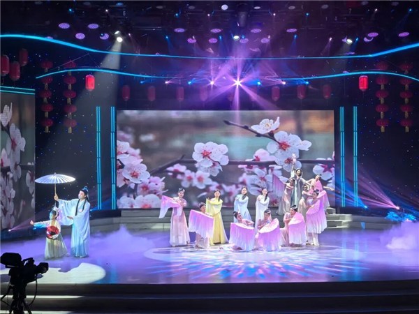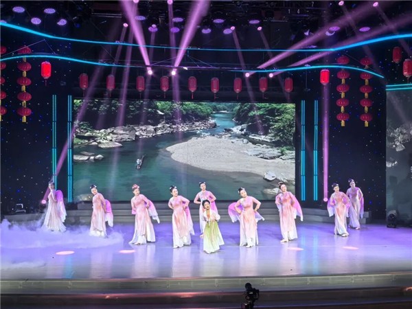 舞台之上,意境拉满。粉色舞裙如纷飞杏瓣舒展,婉转歌声与灵动舞姿相映成趣;大屏上杏花绽放、山水相依的画面,与演员们的演绎完美呼应。悠扬旋律里,是杏花村的烟雨柔情;深情演唱中,是贵池人的乡愁眷恋,每一个音符、每一个动作,都尽显贵池非遗的独特魅力与池州“千载诗城”的深厚文化底蕴。