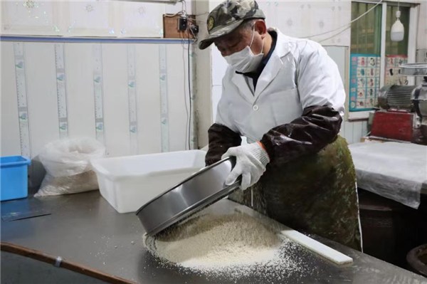 “这是用麻油调和好的糖,接下来要和糯米粉一起充分搅拌、过筛,确保粉质细腻均匀……”食品厂负责人张启根一边介绍,一边亲手演示制作流程。他告诉记者,糕坯做好后不能马上切,要放置一晚充分定型。除了糕胚,还要制作层次丰富的糕芯,加入桂花、金桔丁、黑芝麻等辅料,让口感更香甜。今年厂里启用新机器,压制成型效率更高,品质也更稳定。