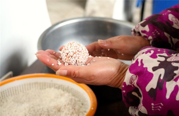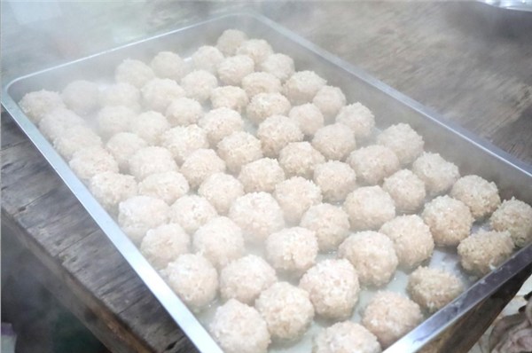 如果说糖藕烧肉是游子们魂牵梦萦的家乡味,那元四喜丸子便是元四村新年里最鲜明的团圆象征。“喜丸子寓意着新的一年阖家团圆、事事顺遂,是村里过年必不可少的吉祥菜肴。”村民章柳英说,每逢过年,元四村家家户户都会围在一起做丸子、话家常。这道藏着年味的家常菜,需要先将新鲜的土猪肉剁碎,加入生姜、黄酒、少许调料调味,顺着一个方向搅打上劲,随后掌心蘸少许清水,将肉馅轻轻团成圆润饱满的大丸子,再均匀裹上提前泡发好的糯米,或是皖南特有的冻米,一个个整齐码入盘中,上锅蒸制。火候一到,蒸好的丸子饱满油润、香气扑鼻,一口咬下,糯米软糯筋道,肉馅鲜嫩多汁,满嘴都是家的味道。