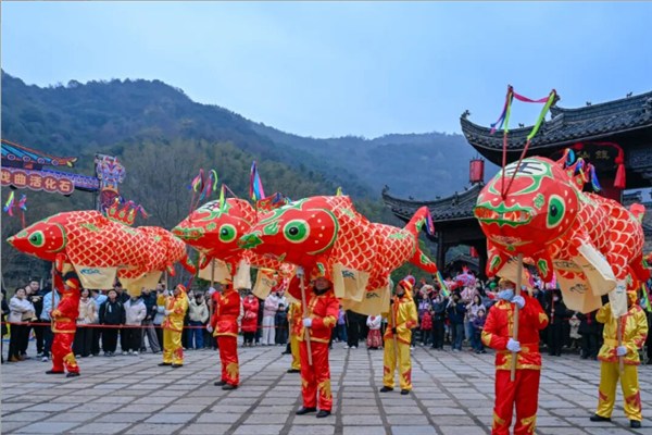 夜幕降临,傩仙镇的氛围达到顶峰。数十盏竹骨纱面的鱼灯次第亮起,造型栩栩如生,承载着祥鱼献瑞、五谷丰登、年年有余的美好期盼。伴随着悠扬的民俗曲调,演员们手举鱼灯沿景区主干道缓缓巡游,灵动的舞姿搭配璀璨灯火,吸引了大批游客紧随欢呼,灯光、人声、笑声交织,漫过古街小巷,整个傩仙镇化作欢乐的海洋,将新春的热闹推向极致。