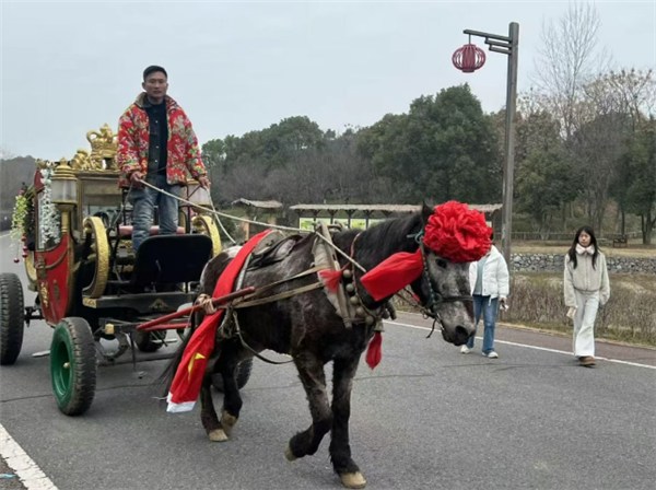 稻草艺术的质朴与诗酒文化的雅致相融,让民俗仿古成为假日里的“流量密码”。走进杏花村文化旅游区,高达数米的牧童黄牛、憨态可掬的卡通造型稻草人点缀田间,将杜牧笔下的诗意转化为可触摸的实景画卷。身着古装的“古村诗圣”与“古村酒圣”穿梭其间,即兴与游客对诗、赠书签、邀饮“杏花村”,让诗词与美酒从书本瓶罐中走出,化作穿越千年的互动。据统计,杏花村文化旅游区春节假期共接待游客3.3万人次,同比增长198%。