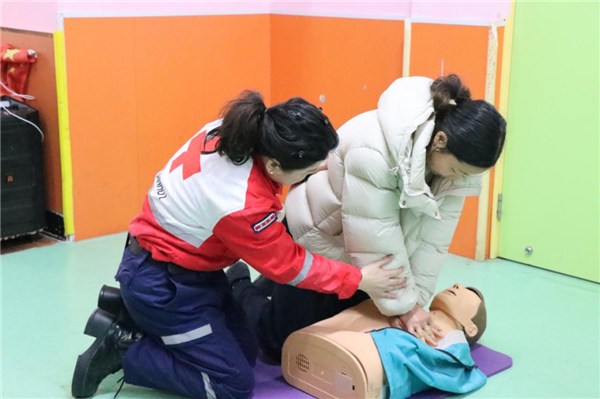 急救课堂上,蓝天救援队队员化身“安全导师”,结合幼儿认知特点,用通俗语言和真实案例讲解日常安全防范要点。针对幼儿易发的异物卡喉、突发晕厥等紧急情况,队员重点演示了海姆立克急救法与心肺复苏术,详细拆解操作步骤,手把手指导教师规范掌握胸外按压深度、开放气道角度等关键动作,通过演示帮助大家快速掌握“黄金四分钟”急救要领,并时不时对台下小朋友进行提问。现场师生认真学习、积极互动,在轻松有趣的氛围中掌握基础急救技能。