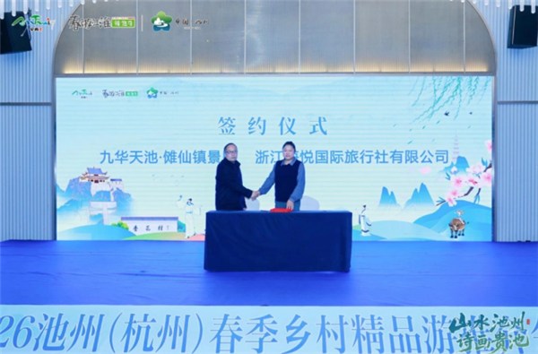 作为本次推介会的核心环节,九华天池傩仙镇景区与浙江海悦国际旅行社有限公司现场签署战略合作协议,标志着双方在客源互送、资源共享、市场共建等方面迈入更深层次的合作阶段。“贵池是杭州市民周末微度假、康养休闲的理想目的地,从杭州乘高铁两小时可直达。九华天池风光秀丽,体验项目丰富,尤其是傩仙镇夜游项目,文化底蕴深厚,独具特色。”浙江海悦国际旅行社有限公司总经理叶霄表示。下一步,该公司将携手景区,在项目开发、市场推广等方面开展深度合作。